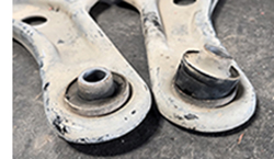 Esses embuchamentos tendem a perder algumas de suas propriedades, como elasticidade e flexibilidade. Com isso, elas ressecam, se rompem e se descolam do alojamento. Nesse caso, como já mencionei, reitero que isso é uma característica de desgaste. Nesse caso vamos substituir as quatro buchas das bandejas, aproveitar para trocar o kit de batente e inspecionar o amortecedor juntamente com o coxim do amortecedor.